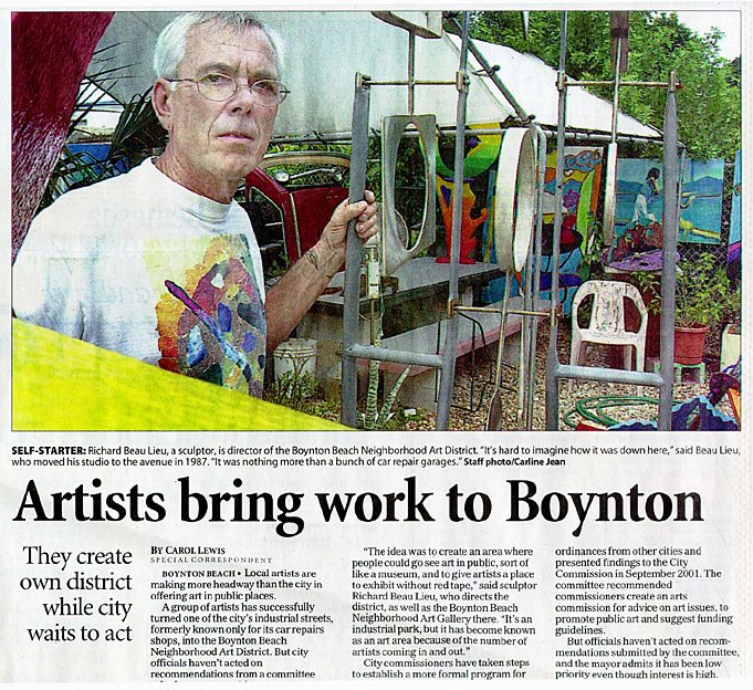 Carol Lewis BOYNTON BEACH Local artists are making more headway than the city in offering art in public places. A group of artists has successfully turned one of the city's industrial streets formerly known only for its car repair shops, into the Boynton Beach Neighborhood Art District. But city officials haven't acted on recommendations from a committee formed to oversee the project. "The idea was to create an area where people could go see art in public, sort of like a museum, and to give artists a place to exhibit without red tape," said sculptor Richard Beau Lieu, who directs the district, as well as the Boynton Beach Neighborhood Art Gallery there. "It's an industrial park, but it has become known as an art area because of the number of artists coming in and out." City commissioners have taken steps to establish a more formal program and to get ideas about ordinances from other cities and presented findings to the City Commission in September 2001. The committee recommended commissioners create an arts commission for advice on art issues, to promote public art and suggest funding guidelines. But officials haven't acted on recommendations submitted by the committee, and the mayor admits it has been a low priority even though interest is high.