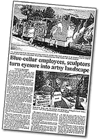 Blue-collar employees, sculptors turn eyesore into artsy landscape By KARIN MEADOWS BOYNTON BEACH - The six yellow front-end loaders serve a new purpose these days. The once powerful, now rusty machines sit side by side in a parking lot where Ray Marcinkoski plucks their parts for repairs on modem dirt movers. But the grading company owner has to maneuver carefully around the machines their scoops are now easels for colorful 4-by-8 foot paintings in this industrial area turned artsy landscape by blue-collar workers and a sculptor. Nearby, an urban roadside once littered with old mattresses, discarded refrigerators and mounds of trash now is lined with metal sculptures and other rustic art - a yellow chrome gear, marble totem poles and Picasso-like paintings by neighborhood children. "There was old cars, refrigerators - you name it. Just imagine 600 yards of junk," said the gruff and tough-looking Marcinkoski, who two years ago made a deal with the City of Boynton Beach to supply dumpsters for the rubbish in exchange for his cleaning up of West Industrial Avenue. Marcinkoski was the catalyst for the beautification. He pushed around sand and dirt encroaching one side of the road to create a bank, then built a wooden fence as a backdrop and hauled in huge chunks of coral for decoration. He hauls in trees and plants he finds discarded on job sites and nurtures them into the bank alongside purchased flowers. Meanwhile, Richard W. Beau Lieu, a sculptor whose work can be seen in galleries and public buildings across the nation, has turned his landlord's vision into a mission. Beau Lieu, owner of the Neighborhood Gallery next door to Marcinkoski's shop, commissioned artists to create metal sculptures and paintings on burlap and canvas for a streetside garden gallery in progress. The result is not a feminine display, or even reminiscent of most Florida gardens, which are lush and tropical. The rugged, rocky landscape exudes a man's touch and is almost desert-like. The 60 pieces along the street include chrome bumper art in the shape of a cactus, a purple metal unicycle tucked between two continued next column |